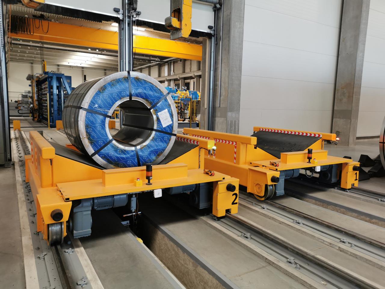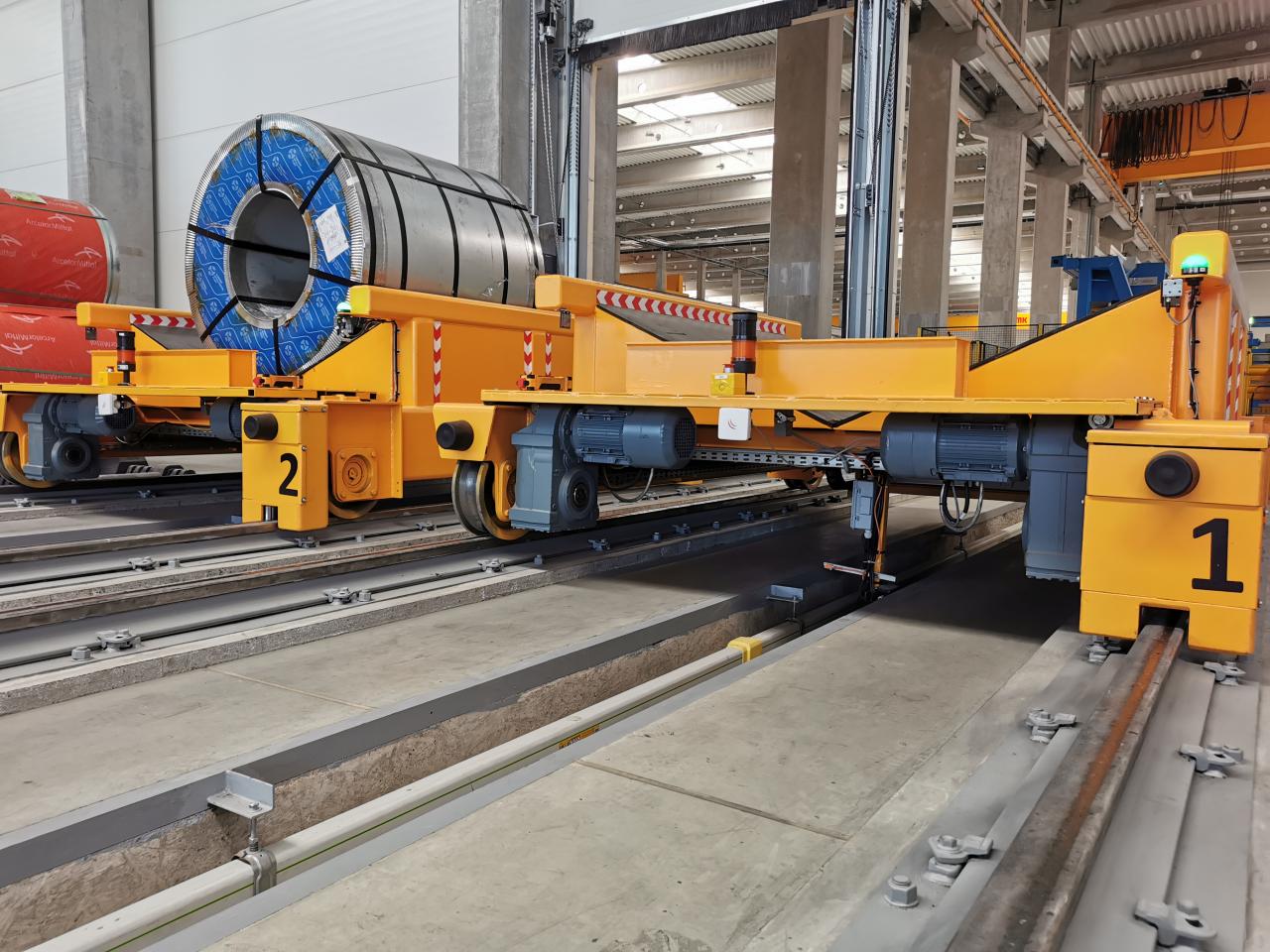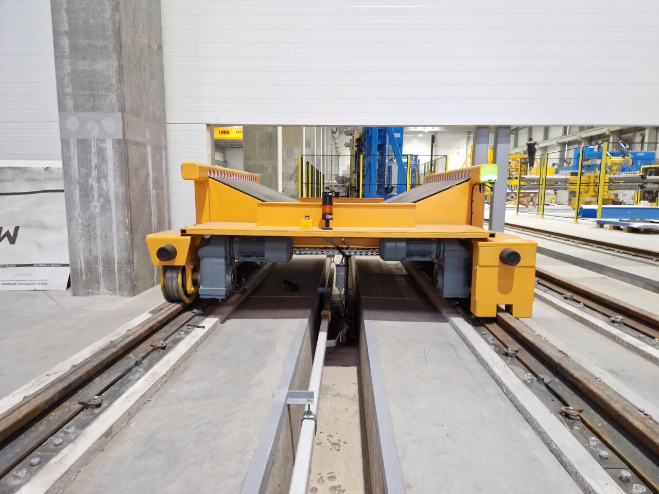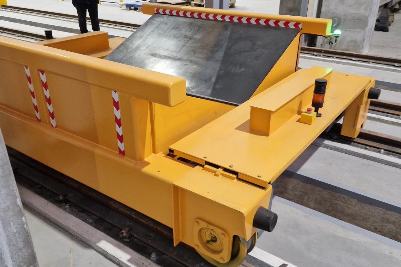 Wykonanie dwóch wózków transportowych o udźwigu 32t przez naszą firmę, zasilanych szynoprzewodem, wyposażonych w falownik oraz sterowanych radiem.
