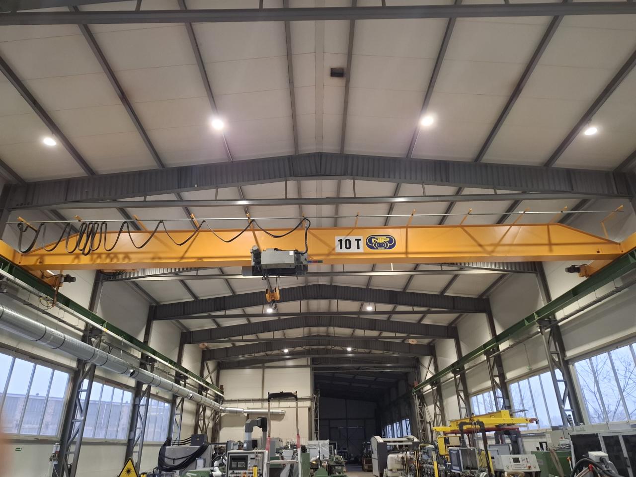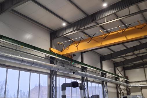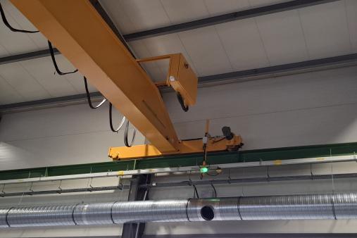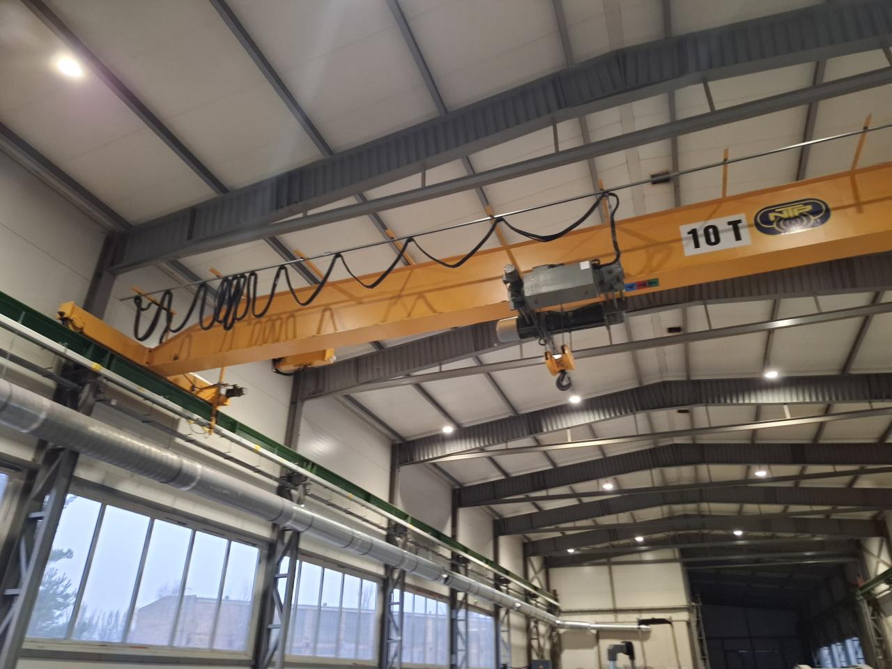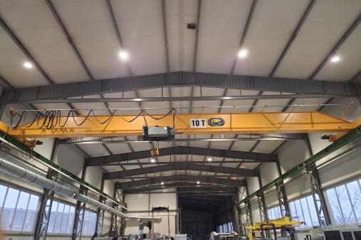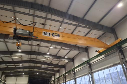 Suwnica jednodźwigarowa o udźwigu 10t i długości ponad 16 metrów zasilana szynoprzewodem, sterowana radiowo.