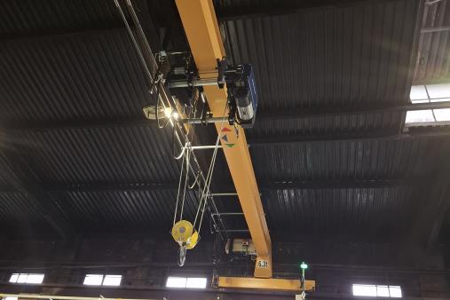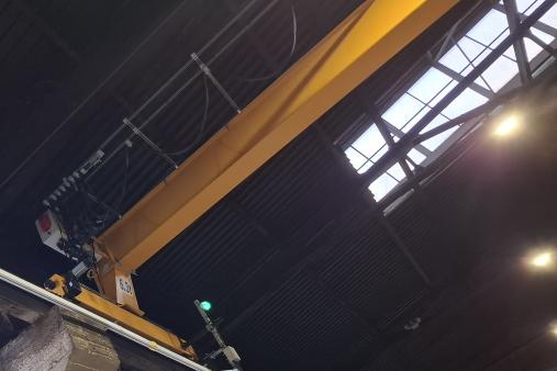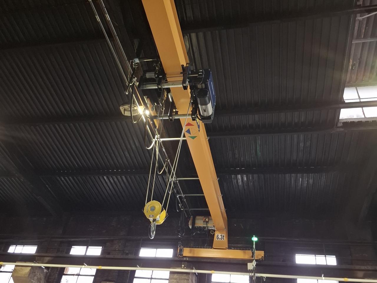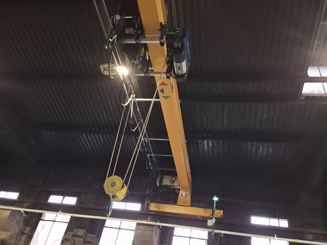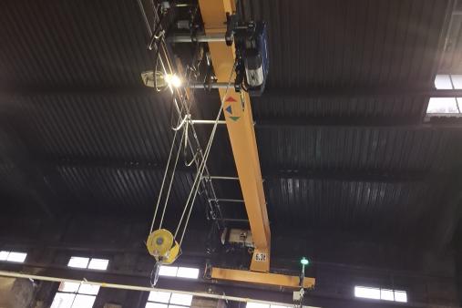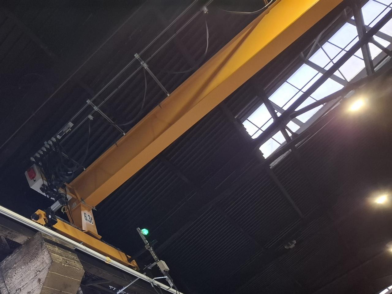 Suwnica jednodźwigarowa o udźwigu 6,3t zasilana szynoprzewodem, sterowana radiowo i awaryjnie z kasety.