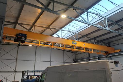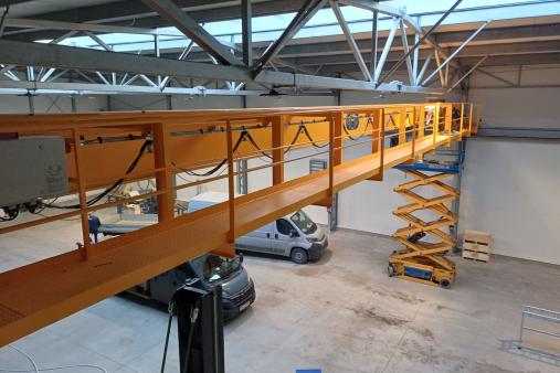 Suwnica jednodźwigarowa natorowa o rozpiętości 18,8m wyposażona w pomost obsługowy.